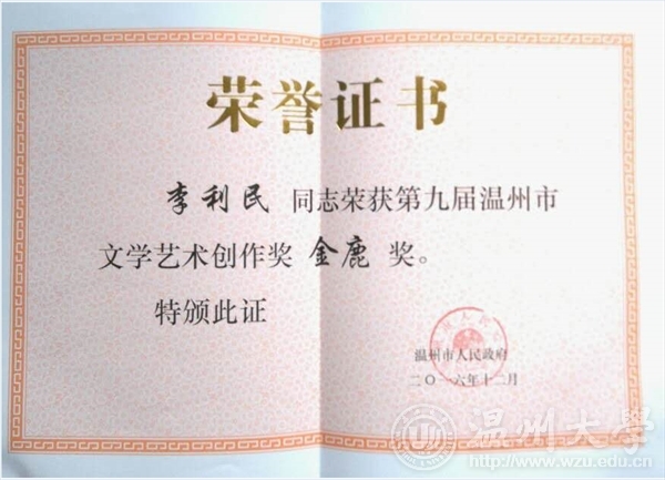 2016年12月29日下午,由温州市人民政府主办,温州市文学艺术界联合会承办的第九届温州市文学艺术创作奖颁奖典礼在温州市工人文化宫成功举办。麻豆视频-m麻豆视频-做爱视频麻豆 李利民老师荣获金鹿奖,该奖项是温州市政府设立的文艺最高奖,每三年评选一次,温州市委常委、宣传部长胡剑谨,温州市副市长郑朝阳出席颁奖典礼并给金鹿奖获得者颁奖。