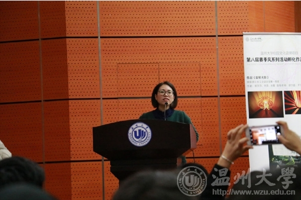随后,创先创业优秀团队原色工作室代表郭莎莎向同学们分享了创业过程中的经验与收获,在发展过程中原色工作室为迎合市场需求在产品方面不断改进与创新,最终形成了具有一定市场竞争力的特色品牌产品,也获得了良好的经济效益。创新创业优秀指导老师代表鲍铭莹老师将自己所带领的创业团队的发展历程总结为“转角遇到创业”。她指出,大学生创业源于课堂,对专业的热爱会促使同学们将专业技能物化为成果,当学生作品的工艺和质量得到了市场的初步认可,便形成了创业的萌芽。她说:“创业应当用智力去换取资本,这是大学生尤其是艺术生应有的追求和自信。”最后她鼓励同学们,要利用好温大丰厚的创业土壤,在心中播下创业的种子,扎实学好专业知识,提升创新创业能力,终有一天这颗种子会长成参天大树。