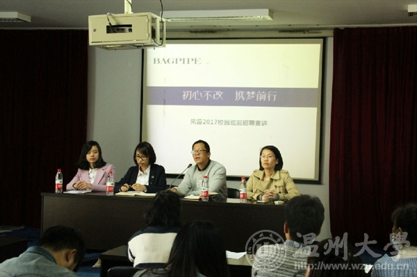 宣讲会上风笛企业人事部负责人向大家展示说明企业情况并播放企业宣传片,讲述了浙江风笛服饰有限公司成立于1999年,是一家自主开发、生产、销售时尚女装和童装的品牌经营型企业,拥有自主品牌:“Bagpipe风笛”、“风风&笛笛”。公司总部坐落于民营经济发达的沿海城市温州,现有员工1500余人,拥有强大而又年轻的研发设计团队、营销团队、品牌建设团队等。