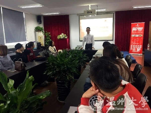 首先由叶筱卉老师对金帝集团的到来表示欢迎并宣布宣讲会正式开始。金帝集团招聘专员国方棋先生向参与的17届毕业生展示ppt并说明企业情况,就公司背景、公司文化、公司现状以及公司对人才培养等方面为同学们介绍了金帝集团企业概况。