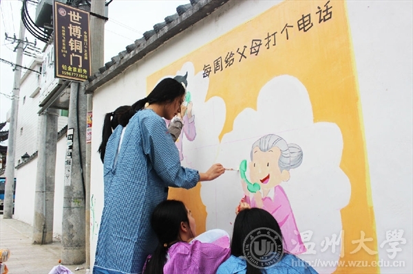 为了进一步响应与落实市委“新青年下乡”主题精神,弘扬传统孝道美德,美院志愿者们携手教师教育麻豆视频 的“小老师们”一同参加了“乐清市绘二十四孝墙绘”的活动。