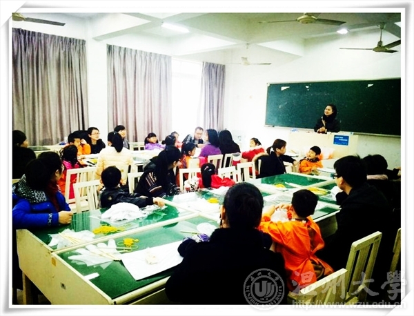 任老师向家长孩子们介绍了“扎染”的发展历史,展示了五颜六色的扎染成品。孩子们都全神贯注的看着,还积极的向老师询问扎染的方法。