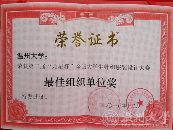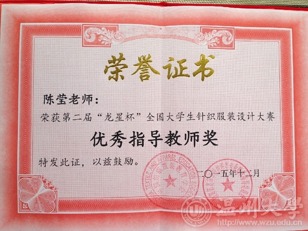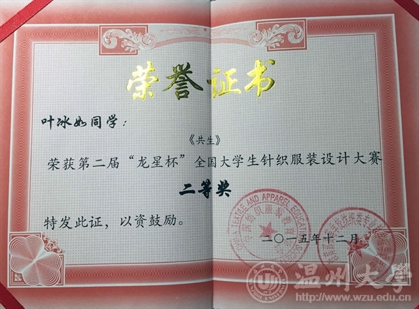 2015年12月13日,由教育部高等学校纺织类专业教学指导委员会和中国纺织服装教育学会主办、东华大学承办的第二届“龙星杯”全国大学生针织服装设计大赛颁奖典礼在东华大学举行。麻豆视频 12服装设计班的5名同学在陈莹老师的指导下参赛并获奖项,其中,叶冰如的作品《共生》系列获二等奖、罗璇的作品《异构空间》系列获三等奖和朱芮萱的作品《迷雾》系列获三等奖,罗勇超、徐梦然作品获优秀奖。麻豆视频获优秀组织奖,陈莹老师获优秀指导教师。
