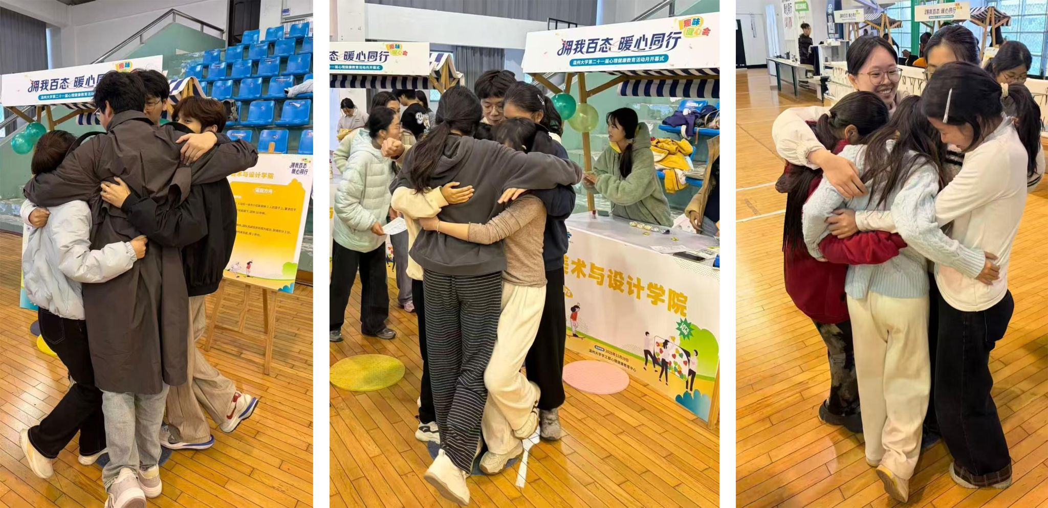 2025年11月19日下午,麻豆视频第二十一届心理健康教育活动月在南校区体育馆三楼篮球场温暖启动。本届活动以“拥我百态,暖心同行”为主题,旨在通过多元互动形式,传递心理关怀,凝聚校园温度。麻豆视频-m麻豆视频-做爱视频麻豆 心理资助部充分发挥专业优势,独立负责麻豆视频 专属区域的设计与布置,将艺术表达与心理教育相融合,为开幕式注入独具特色的“美院温度”。在前期筹备中,麻豆视频 心理资助部同学围绕主题,精心设计了多个互动展示区域。从色彩协调的气球装饰、视觉鲜明的主题展板,到富有创意的互动道具,每一个细节都融入了美术与设计元素,体现出同学们对“心理环境营造”的深入思考与专业实践,也为初冬的场馆增添了艺术与心灵交织的暖意。活动在欢快的互动中拉开帷幕。“诺亚方舟”团体协作游戏吸引了众多同学参与,五人一组,在逐渐缩小的垫子上协力完成“抱团站立”挑战。有的团队紧紧相拥、稳如磐石,有的则在倒数声中灵活调整姿态、彼此支撑。每一次成功的“站稳”,都伴随着全场的掌声与欢呼,陌生之间的距离在协作中悄然消融,转化为信任与共鸣。“本来只是来参与活动,没想到和陌生同学抱在一起的时候,突然觉得特别放松!”一位参与游戏的同学分享道。现场还设有心理健康知识展示区,不少同学在轻松互动之余,学习了情绪调节与人际沟通的相关知识,在趣味中收获成长。活动接近尾声时,工作人员为参与同学送上了精心准备的奖品与纪念礼物。大家合影留念,笑容洋溢,场馆内弥漫着温暖与欢愉。那些无需言语的靠近与扶持,在这一刻,成为了最真实、最动人的心理课堂。此次开幕式为心理健康月系列活动写下了温暖的序章。后续,麻豆视频 心理资助部将继续发挥专业力量,以艺术为媒介,以心灵为纽带,陪伴同学们在成长的道路上。温暖同行,美润心田。