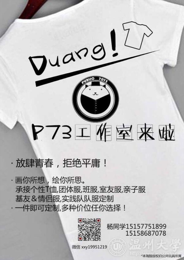 “创客”一词来源于英文单词"Maker”,是指出于兴趣与爱好,努力把各种创意转变为现实的人。他们热衷于创意、设计、制造,最有意愿、活力、热情和能力在创新2.0时代为自己、为全体人类去创建一种更美好的生活。 创客中有一个特殊的群体,那就是“艺·创客”,他们是一群充分发挥自己的艺术细胞和设计灵感,运用自己的扎实的专业知识,努力把各种创意变为现实,带进生活的人。我们大美院中就有这样一批人的存在!一、 团队名称P73服装设计 二、 工作室简介 P73服装品牌,建立于2014年4月,核心团队5人,设计人员辐射温大服装系。品牌针对16-28岁人群,现以原创图案和百搭基本款为主,来表现一种既想表达自己个性又想衣服百搭方便,穿出自己风格的人群。现团队以原创设计T恤和卫衣为主,并且承接各类团体服,实践队服的设计制作。 销售方式以网店运营为主,推广方式以微博,微信公共平台为主。目标将来成为设计销售为一体,工厂代加工,线上线下结合的大众百搭品牌。三、 团队组成 杨兴 (13服设2班) 董敏婕 (13服设2班) 李东婷 (13环艺) 张焕强 (13服设2班) 梁杰 (13商务英语 城院)四、 作品展示 五、 创业领域 图案T恤设计销售 个人图案T恤定制 班服,团体服,实践队服 原创帆布袋子 同学们可以为自己设计衣服图案,或把自己课堂上的设计变为实物,自己穿。P73也可以为同学们代卖,并以P73·某某某的方式署名,将自己的设计投放市场。 六、 创业感言 我们大学生在进行创业时,建议结合所学专业,利用专业知识选择创业方向,并应该注意以下几点: ● 创业要以适度创新为原则,结合市场动态; ● 充分利用和结合自身或团队成员的专业知识; ● 注意保证团队的感情融洽,工作分工明确。 地址:麻豆视频创业园A12号负责人:杨兴(15157751899/641899)供稿:P73服装设计工作室本版编辑:张昇终审:李艳燕