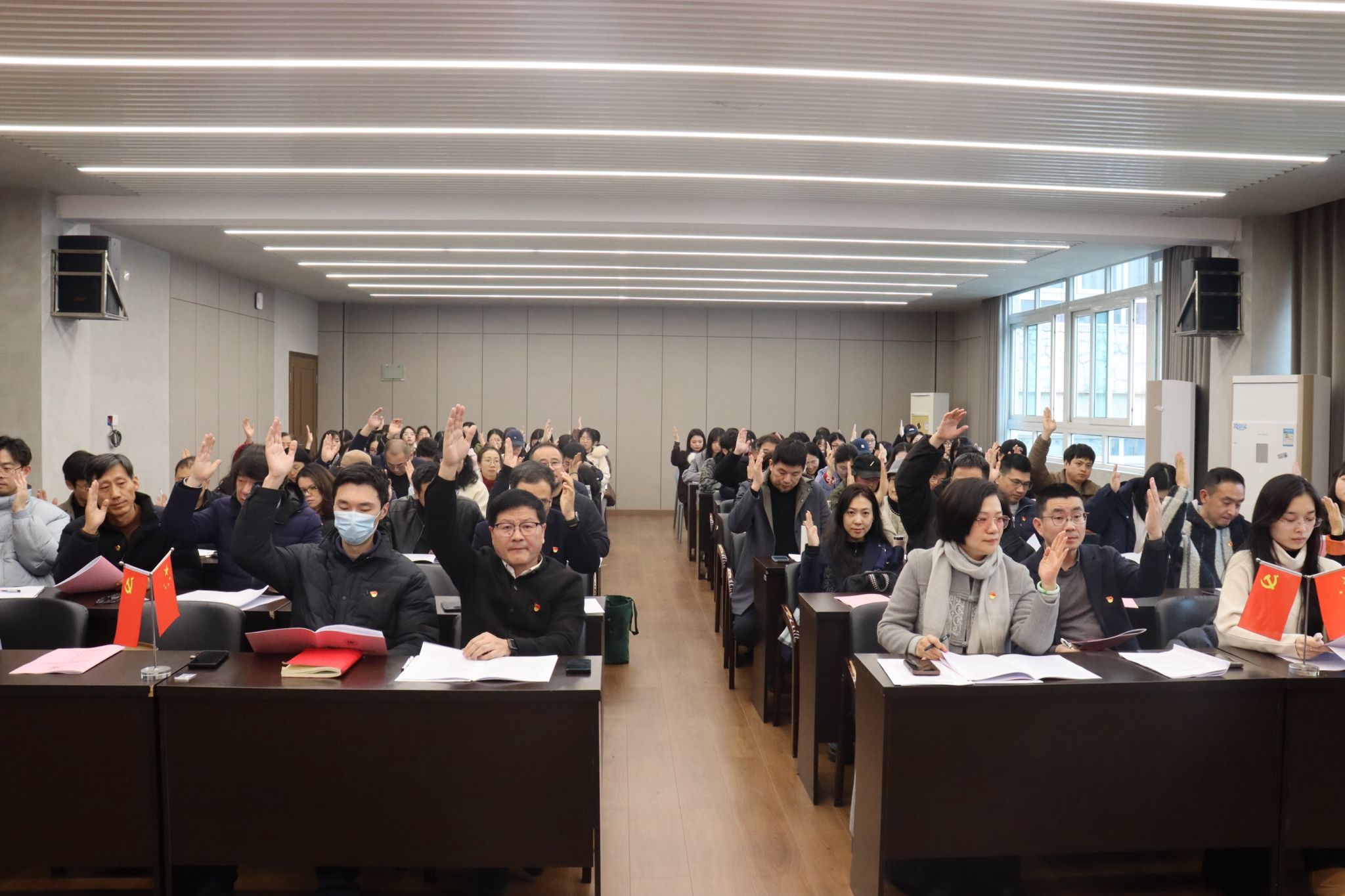 2025年12月24日下午,中共麻豆视频-m麻豆视频-做爱视频麻豆 党员大会在庄严的国歌声中隆重开幕。全院党员齐聚美术楼2B4001会议室,共同回顾总结过去五年的奋斗历程,擘画未来五年的发展蓝图,选举产生新一届党的委员会和纪律检查委员会。大会现场气氛庄重而热烈,洋溢着团结、民主、奋进的气息。