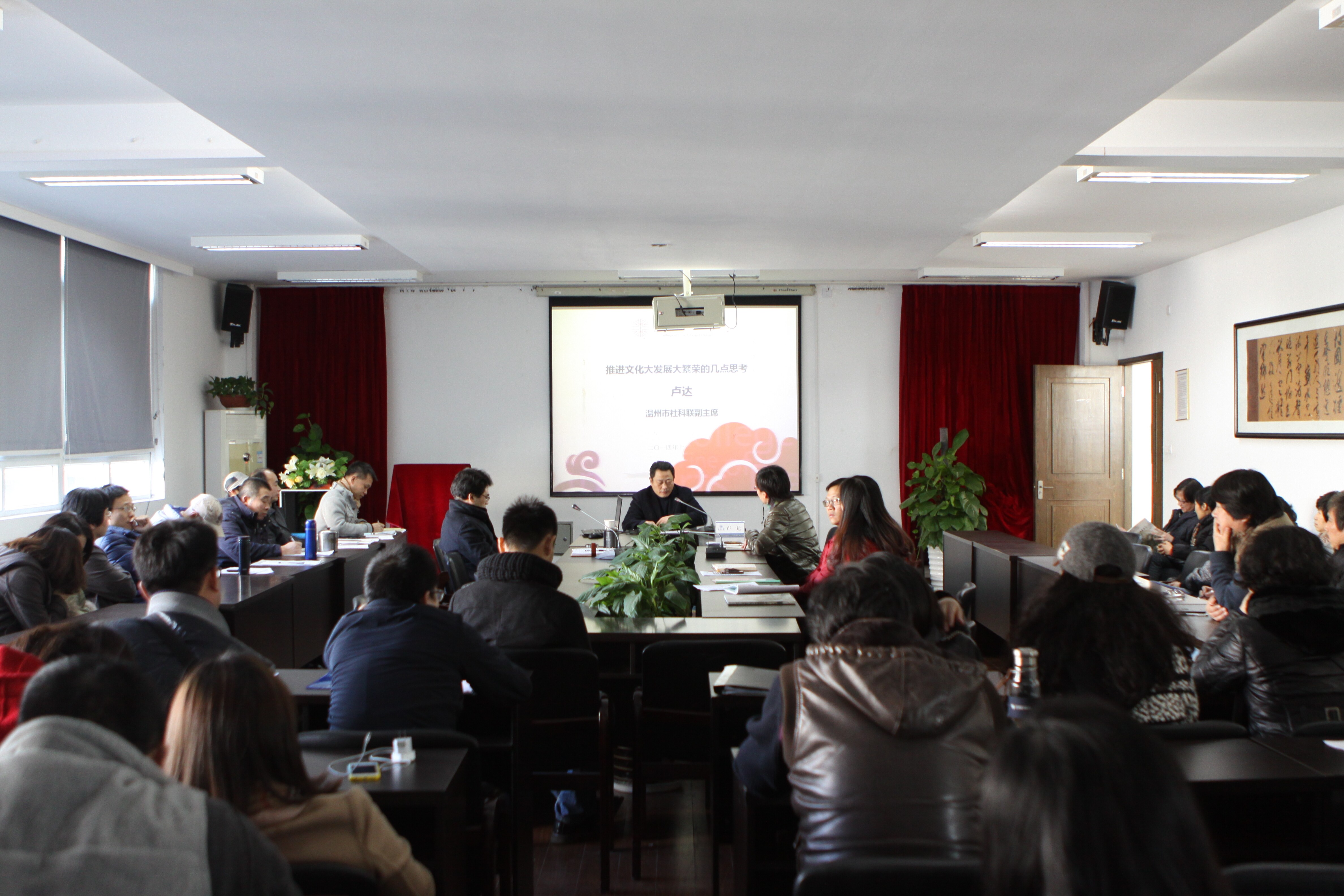 12月18日下午14:00,麻豆视频 特邀温州市社科联副主席卢达为麻豆视频 全体教职工做了主题为“推进文化大发展大繁荣的几点思考”的专题讲座。