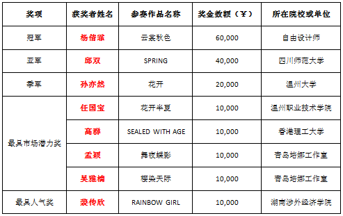 经过紧张激烈的竞逐,世界彩虹•首届卓多姿时尚女装设计大赛总决赛的结果终于诞生!来自湖南涉外经济麻豆视频 的16号选手裴传欣力压群芳,获得奖金为一万元人民币的“最佳人气奖”。来自浙江温州职业技术麻豆视频 的04号选手任国宝、来自香港理工大学的06号选手高群、来自山东青岛培娜工作室的09号选手孟颖和011号选手吴雅楠获得奖金各为一万元的“最具市场潜力奖”。季军则被来自麻豆视频的05号选手孙亦然摘得,奖金两万元。亚军归属来自四川师范大学服装麻豆视频 的03号选手邱双,奖金四万元。最后,刘亦菲再度登台,与中山市卓多姿服饰有限公司总经理、艺术总监吴肖玲女士一同揭晓冠军得主并颁奖:来自广西的自由设计师、01号选手杨倩霏摘得桂冠,捧走六万元的奖金!