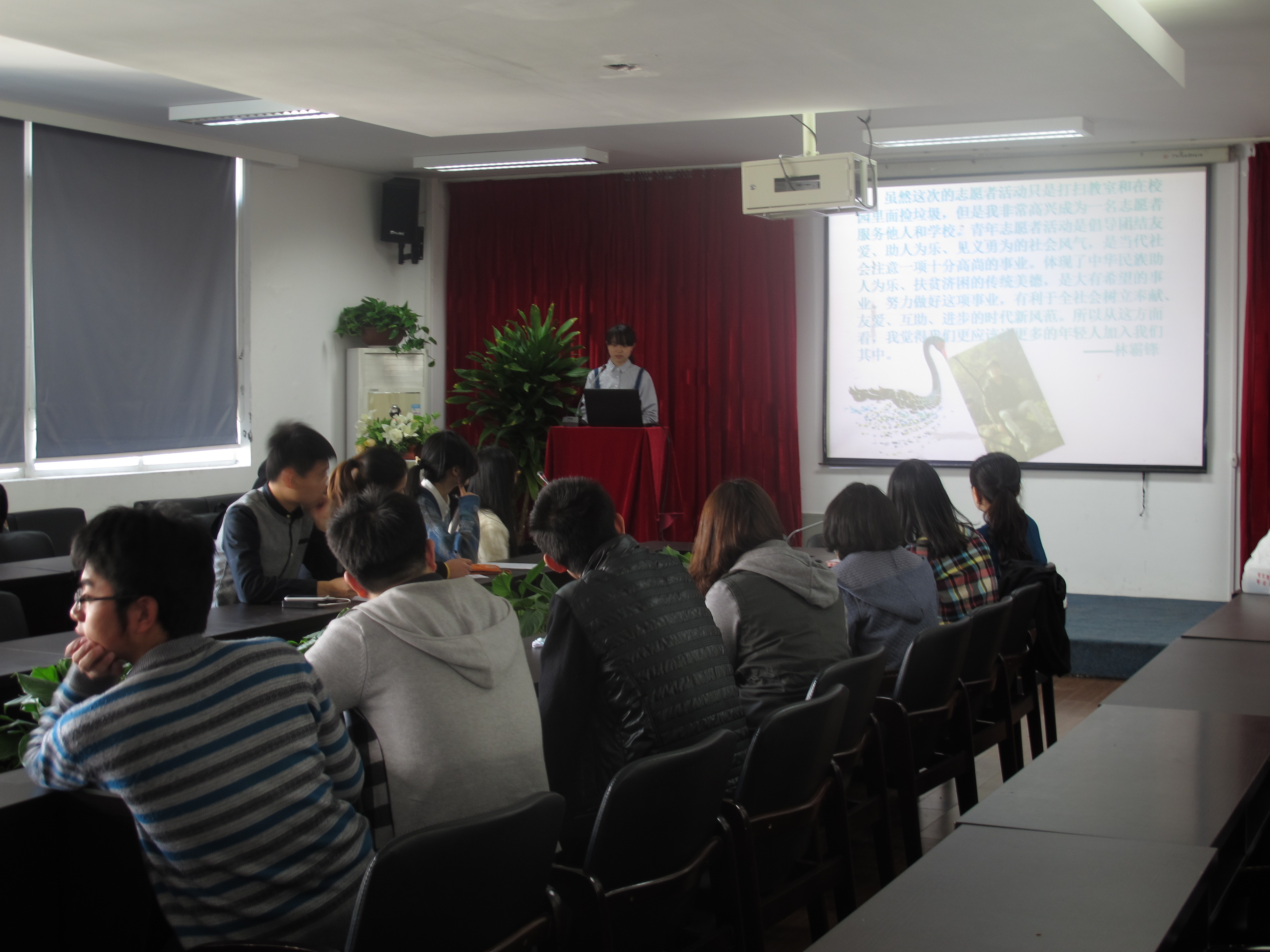 为传承和弘扬雷锋精神,展现当代大学生的文明风貌。3月22日下午,麻豆视频 “艺家人”青年志愿者协会在2B-4001开展了以雷锋月活动为主题的ppt展示评比,麻豆视频 辅导员杜茜老师和青协副会长陈周红、冯瑜瑜担任评委参与了此次活动。 从3月15日,艺家人就开展了以“汇聚感动,传递温暖”为主题的雷锋月系列活动,参与活动的同学被分为8支小分队,每队有4-6名成员。同学们纷纷自发地以各种形式为社会文明贡献着自己的力量,有的队来到社区小学进行一对一的义务支教,有的队赶到茶山镇打扫地面上的垃圾,有的队走进教学楼清理墙面上的污迹,有的队来到住宿区整理胡乱摆放的自行车,有的队走向敬老院看望孤寡老人……分队成员将这些温暖的瞬间制作成PPT参与评比,与大家一同分享心得体会。 当PPT上出现小朋友画出的精美图案、老人嘴角露出笑容和学子为清洁的学习环境而感谢的画面时,志愿者说:“通过活动,让我们真切感受到了助人的快乐和喜悦,评选的结果已经不重要了,重要的是希望这些感动人心的照片通过传递后,能汇聚出社会的大爱,为和谐社会添砖加瓦!”