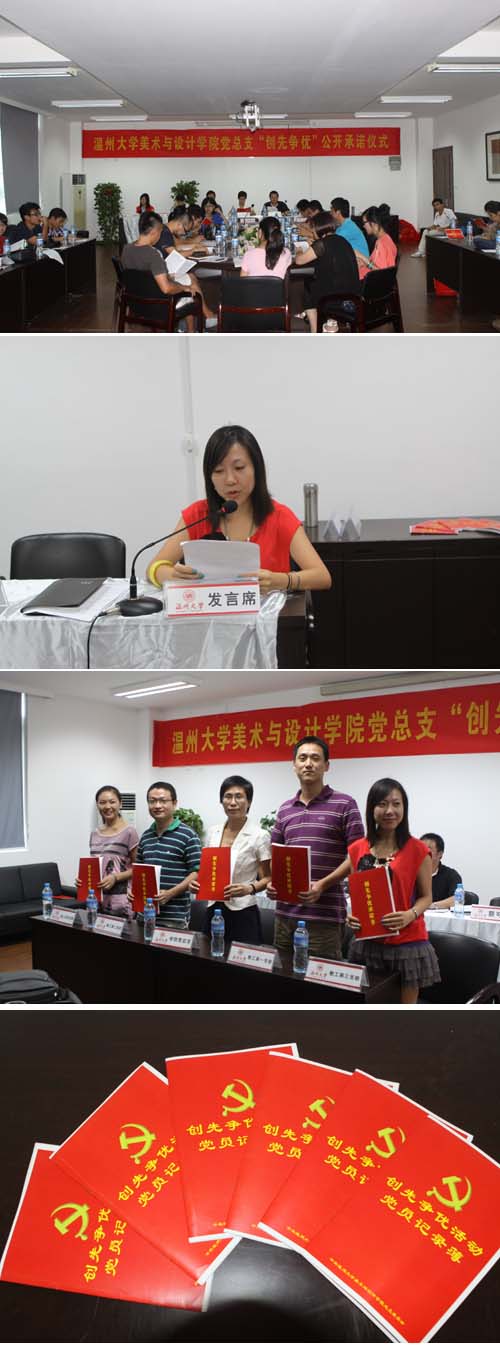 “我代表教工第一党支部在创先争优活动中作如下承诺:爱岗敬业,具有高度的责任观念。上课前认真备课,努力上好每一堂课,课后认真批改作业,尽心尽责地完成本职工作……”;