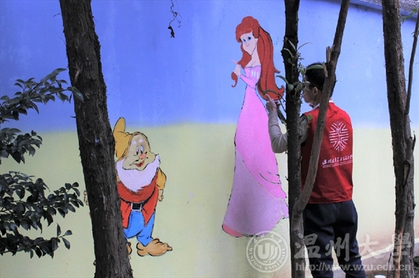 活动开展前,志愿者们都按照规定时间提前到达高教园区始发站集合,再由负责人带领大家前往活动地点,经过等车、转车大概五十分钟左右终于到达了终点。抵达后,园长带领负责人和志愿者们先看了绘画场地,以便大家充分了解所画场地面积方便作画。随后回到幼儿园吃午饭,吃完饭后稍事歇息便开始了工作,在安排好要绘画的墙面和人员分工后,大家迅速的进入状态纷纷开始着手画起来。定位置、勾大轮廓线条、精修定稿、细致调色以及上颜色,每个人都有条不紊地摆动着手中的画笔,每一组都分工明确,井井有条,每一组在绘画中都严捉细节,同时充满热情。时间过得很快,眼看着活动快要结束了,志愿者们赶紧把最后的小细节进行再一次的修正,不一会儿,一幅幅形象生动、色彩绚丽、形式新颖的画面呈现在了大家的眼前,作品也得到了幼儿园老师们的赞赏。因为活动开展前此活动的负责人几次联系幼儿园园长做了充足的活动前期准备工作,所以避免了很多不必要的麻烦,活动开展的很顺利。