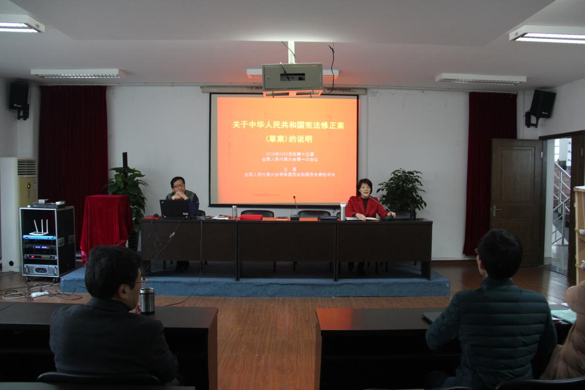 杨振海副书记首先回顾了历次宪法及修正案的演变并指出:宪法是国家的根本法,是治国安邦的总章程,是党和人民意志的集中体现,宪法只有不断适应新形势、吸纳新经验、确认新成果、作出新规范,才具有持久生命力。1982年宪法公布实施后,根据我国改革开放和社会主义现代化建设的实践和发展,在党中央的领导下,全国人大于1988年、1993年、1999年、2004年先后四次对1982年宪法即我国现行宪法的个别条款和内容作出必要的、也是十分重要的修正。随后杨书记阐明了此次宪法修正案(草案)的总体要求和原则。总体要求是要高举中国特色社会主义伟大旗帜,全面贯彻党的十九大精神,坚持以马克思列宁主义、毛泽东思想、邓小平理论、“三个代表”重要思想、科学发展观、习近平新时代中国特色社会主义思想为指导,坚持党的领导、人民当家作主、依法治国有机统一。宪法的修改要体现政治性、程序性、人民性、专业性,遵循以下四项原则:一是坚持党对宪法修改的领导;二是严格依法按程序推进宪法修改;三是充分发扬民主、广泛凝聚共识;四是坚持作部分修改、不作大改。
