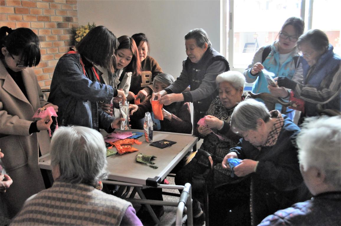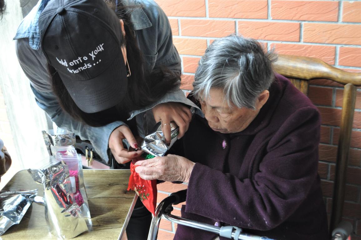 3月25日,美院“艺家人”青年志愿者协会的志愿者们来到了名盛老人公寓,与老人们共度温馨周末。 志愿者们早早地就准时来到了集合地点,在经历了40分钟的路程后到达了目的地。上午和老人们一起在餐厅做香囊,与老人们一起将薄荷叶、白芷等等有助于安神睡眠的材料放进香囊里,对于不方便活动的老人志愿者们便在在房间中与老人一起制作,气氛和乐融融。到了下午的时候,我们还帮助敬老院的护工们一起刨番薯皮切番薯,拔草除草,拖地打扫和洗碗。同行的志愿者里有三四个人会说温州话,他们将其他志愿者们的话转述成温州话给老人们听,虽然语言上沟通稍微有些障碍但丝毫不影响志愿者与老人们之间的交流。 让老人们讲述他们自己的事迹,聆听他们那个时代的精彩故事,对于志愿者们来说是十分受益的,既可以了解时代留下的印记,又可以让老人们的心事有所表达,可能老人同样的一句话会重复好几遍,但是我们需要理解他们,需要在每次聆听的时候,用更多的耐心与包容去关怀他们。