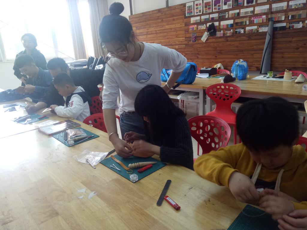 下午一点半,家长带着小朋友们陆续来到了鞋靴实验室。活动开始,大家在手工老师的带领下进入了教室。在正式制作之前,同学们给大家分配了原材料、工具,还详细讲解了制作手工皮具工艺流程。 正式开始制作,经过同学们的教学,家长和小朋友们使用各种工具经过不断地摸索和尝试,很好的制作出了属于自己的手工卡包。