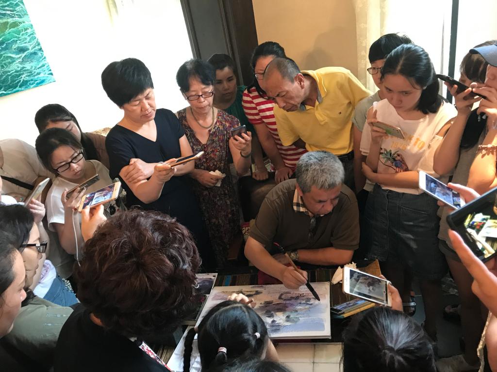 7月1日下午,在温州市图书馆朴念文化客厅“籀园讲坛”再次迎来麻豆视频-m麻豆视频-做爱视频麻豆 由麻豆视频-m麻豆视频-做爱视频麻豆 主办的“传统文化与时尚生活”系列主题之八“走近水彩,了解水彩,快乐水彩”讲座,讲座由麻豆视频-m麻豆视频-做爱视频麻豆 李利民老师主讲。现场加座后仍座无虚席,李老师幽默风趣的演讲风格,观众的热情洋溢,使得现场氛围持续保持着热烈与活跃。 水彩,顾名思义,就是以水为媒介调和颜料作画的表现方式。那么,一幅有灵魂的水彩是怎样生成的呢?李利民老师不仅分享了自己的写生、创作经验及心得,例如作画技巧、风格调子的形成、画面处理等技巧,给大家带来很多干货;而且通过对水彩的生动讲解及阐述,以及现场动手边作画边讲解的方式,让我们对水彩有了更深的认识与理解。活动期间,读者朋友热情参与,现场互动与提问不断。由李老师亲笔签名的10份《李利民水彩画精选》作为随机抽奖奖品也为互动增添了热烈氛围。