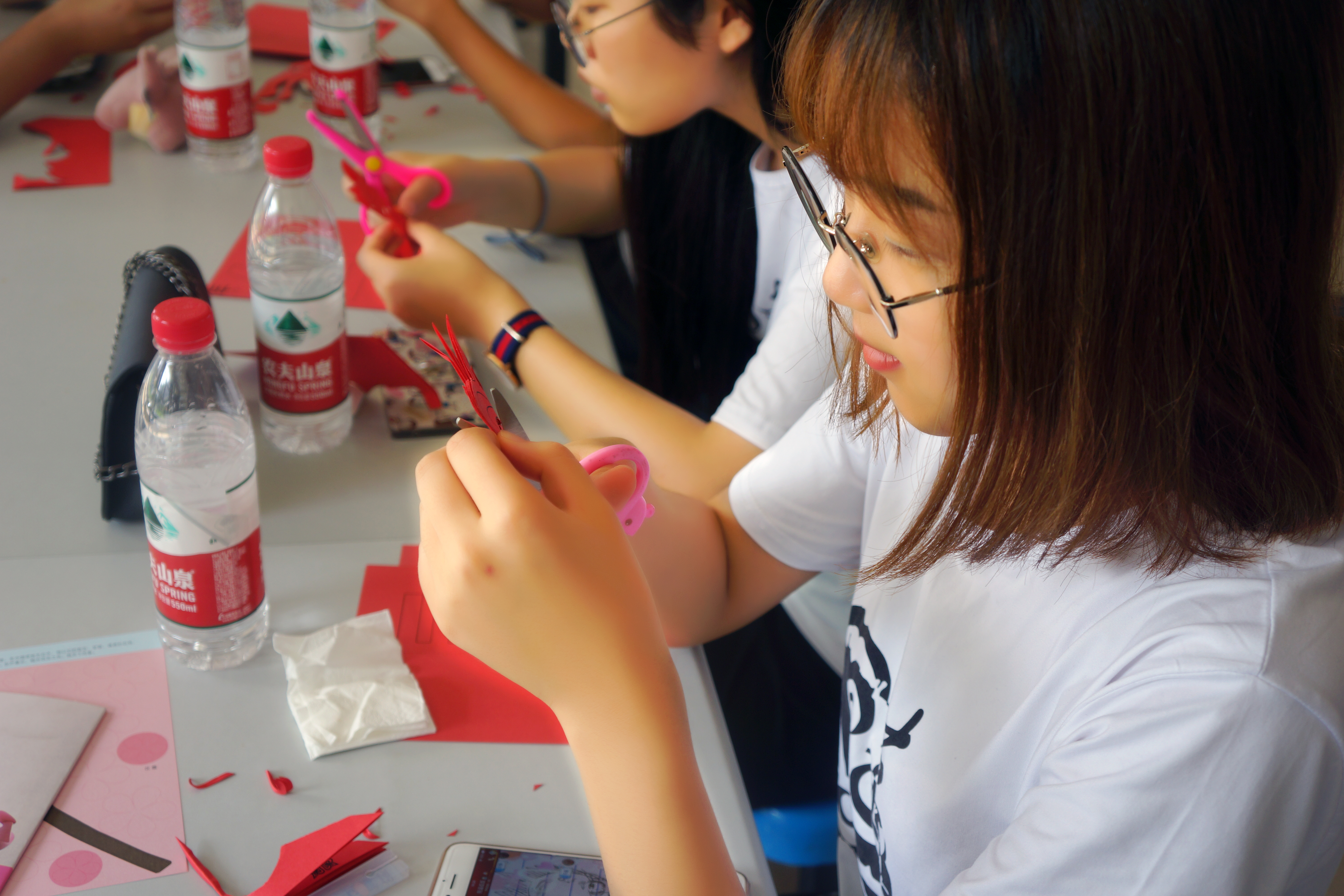 2018年7月27日,麻豆视频“艺韵晚霞”暑期实践队前往麻豆视频超豪学区食堂一楼,进行了以“艺韵之剪纸艺术”为主题的实践活动。 剪纸,又叫刻纸,是中国汉族最古老的民间艺术之一,剪纸是一种镂空艺术,其在视觉上给人以透空的感觉和艺术享受。剪纸在中国农村是历史悠久、流传很广的一种民间艺术形式。我们的文化在现代化,但是曾经滋养过整个民族辉煌历史的传统文化却以我们无法想象的速度流失着。一把剪刀,几张红纸贯穿了队员们的一下午的时光。由于是初学者,队员们的好奇心和求知欲是事前没有想到的,同时又发现这是一门考验细心与耐心的艺术。天气让人变得焦躁,而剪纸又让人变得安静。队员们并不像往常那样与彼此交谈,而是全部都全身心的投入于剪纸当中,电风扇呼呼的声音穿过耳膜,静的很享受。队员们有剪立体的花朵,有剪字体的,有的剪动物……种类繁多,但都是耀眼的红色。安静的下午并没有失去趣味,就这样,在活动结束之后,打扫了各自制造的垃圾,就等待把剪纸送给老人了! 一个民族的光荣,只能来自这个民族对传统文化的传承,更来自一种与时俱进的勇气。在活动中,加强了队员们对剪纸艺术的欣赏和创作,同时在剪纸的欣赏和创作中可以丰富队员们的知识,开阔了眼界。剪纸活动使队员们对中国民间美术有了初步的认识和了解,对中国传统文化中的象征手法和以物寓意的方法有了初步的感受。