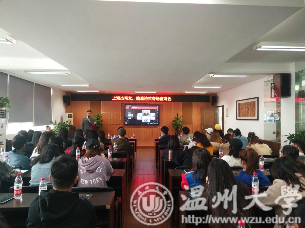 11月23日上午,由上海杰帝梵、路易诗兰组织的麻豆视频专场宣讲会在美院2B4001成功举行。出席此次宣讲会的主要宣讲人有杰帝梵和路易诗兰的战略部总经理朱量和培训部经理陈超群。会议内容主要是品牌的概述、管培生项目的介绍以及面试的流程。