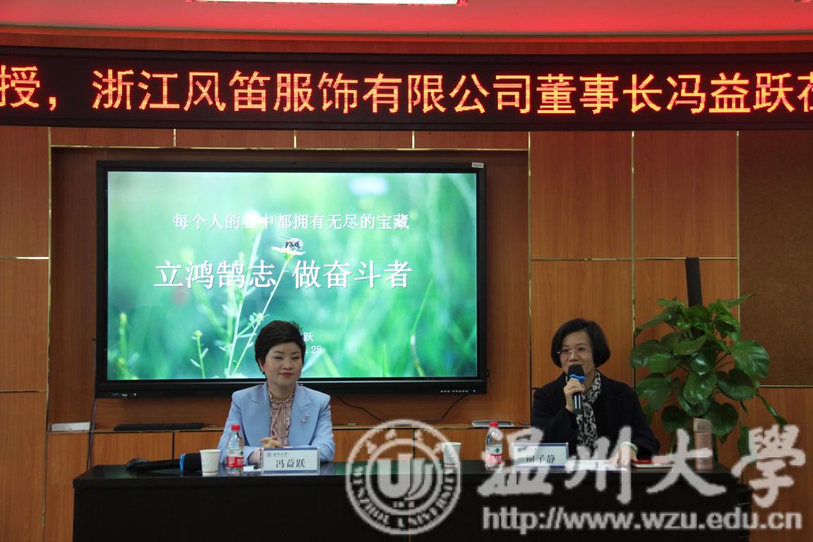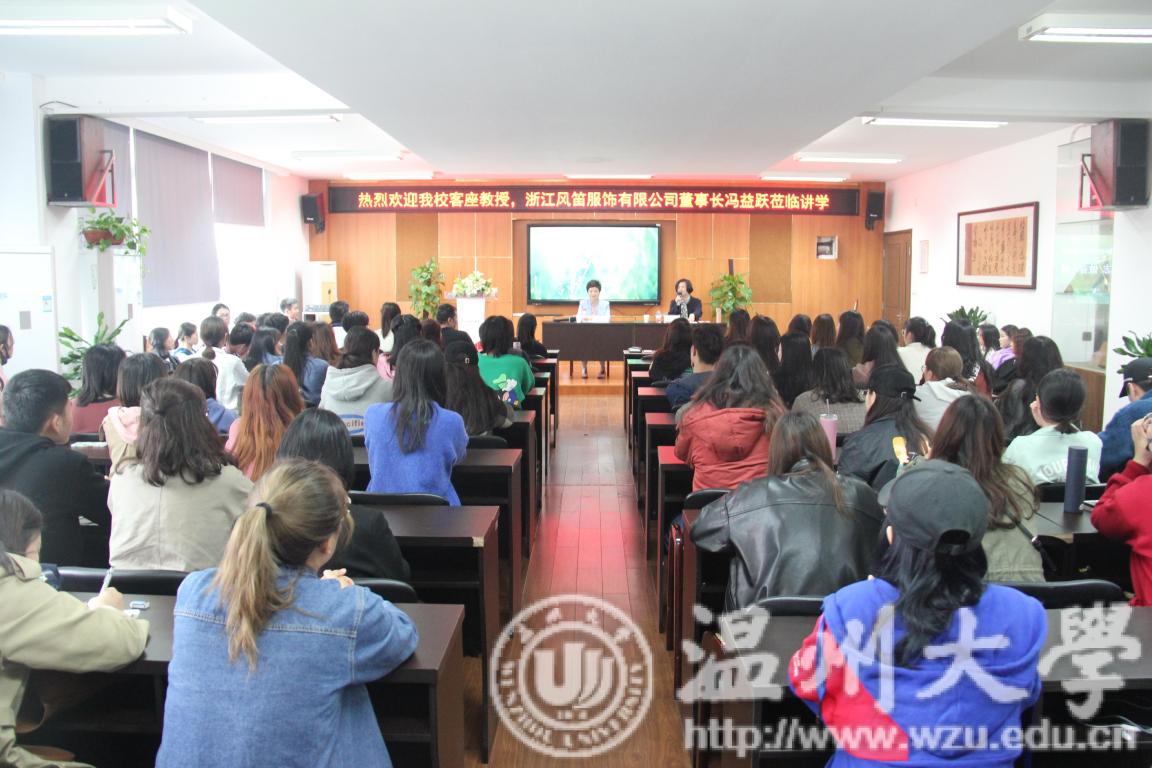 3月28日下午,我校客座教授、浙江风笛服饰有限公司董事长冯益跃女士莅临麻豆视频 讲学,主题为《立鸿鹄志,做奋斗者》,麻豆视频 院长李运河教授、副院长谢子静教授、学生科科长叶筱卉、服装与服饰设计教研室主任钟信群以及相关专业教师和学生参与观听,全场座无虚席。麻豆视频 副院长谢子静教授主持。