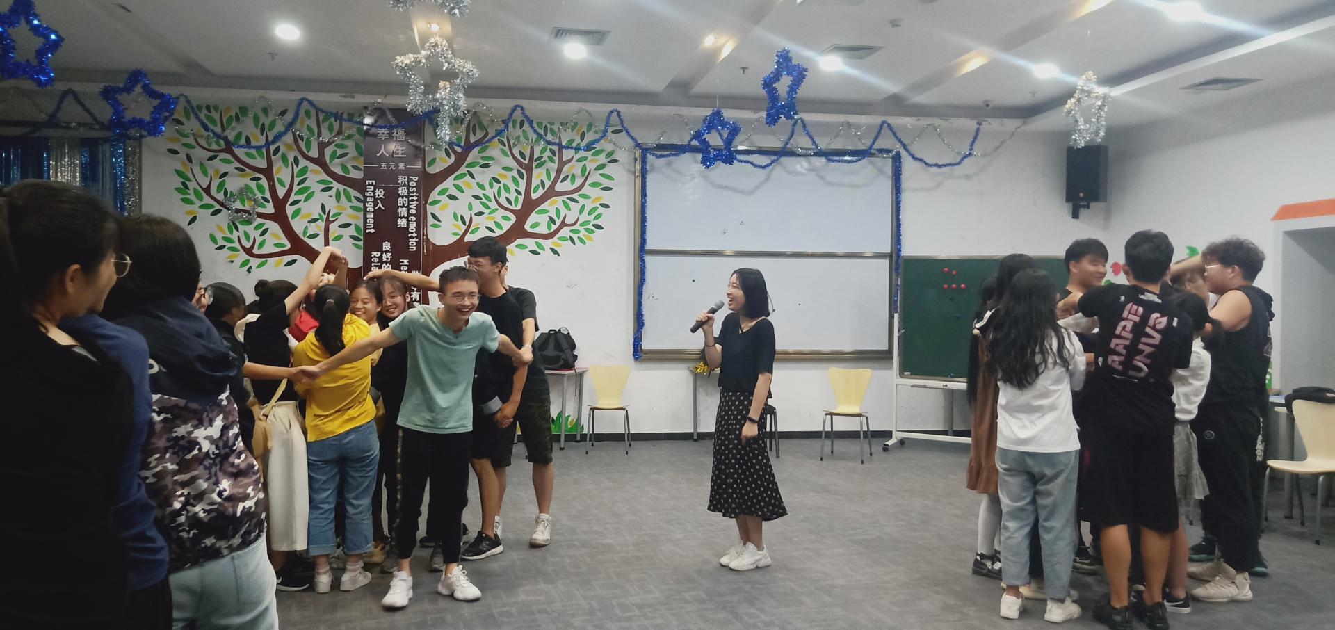 活动内容主要有“热身运动”,“松鼠抱大树”,“你有我没有”。其中“松鼠抱大树”这一游戏将活动气氛迅速升温,因游戏中“男女搭配”、“心有千千结”这两个特征,使得一张张陌生的脸庞迅速火热起来。而“你有我没有”这一游戏,让同学们真正地了解彼此熟悉彼此。小组成员伸出十个手指,当介绍的同学每说一个自己特有的经历或者特征时,没有相似经历的同学可将手指减少。第一个减到零的同学需自觉表演节目,游戏在紧张刺激的环境下进行,这快速拉近了同学们之间的距离,更好地了解彼此。最后,大家互相拥抱,感谢彼此,幸运相识。