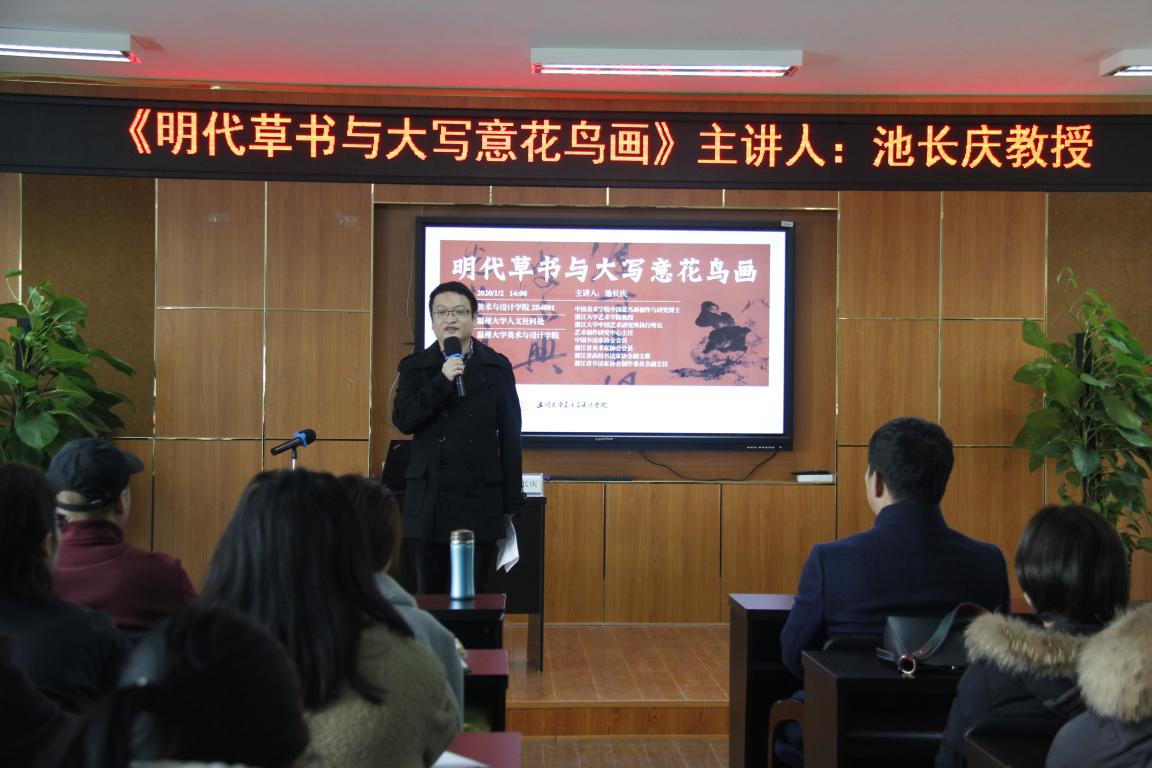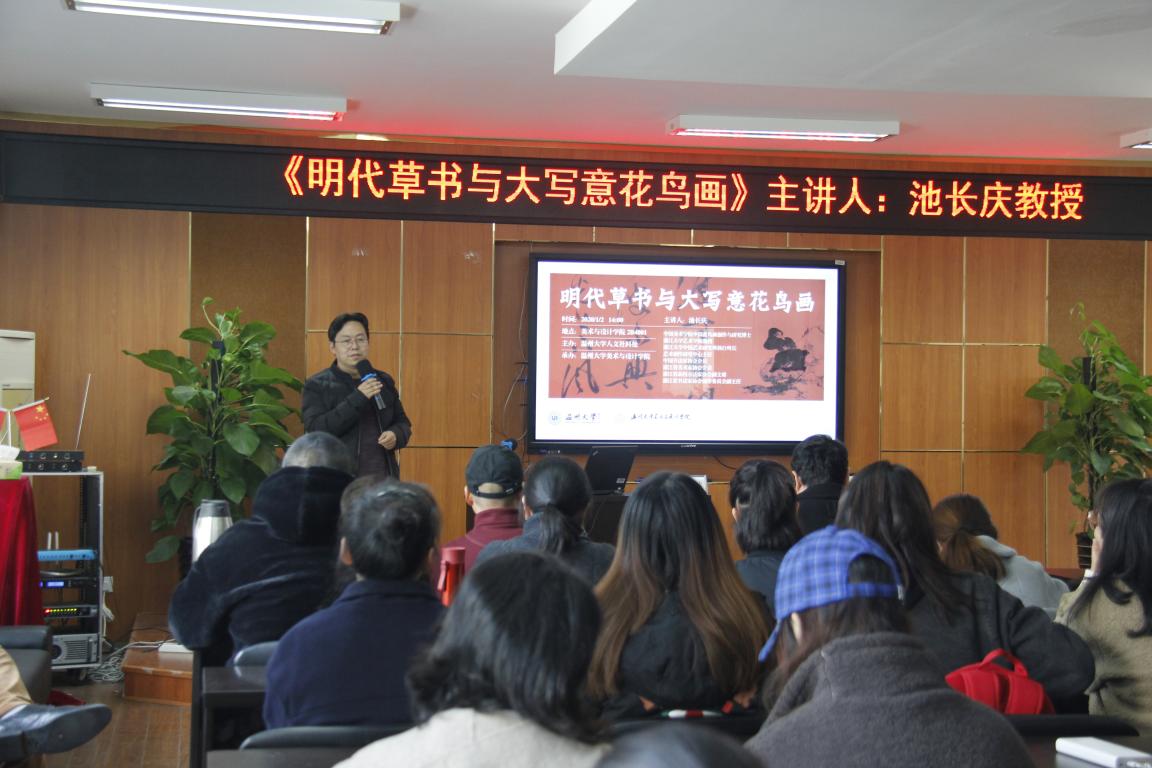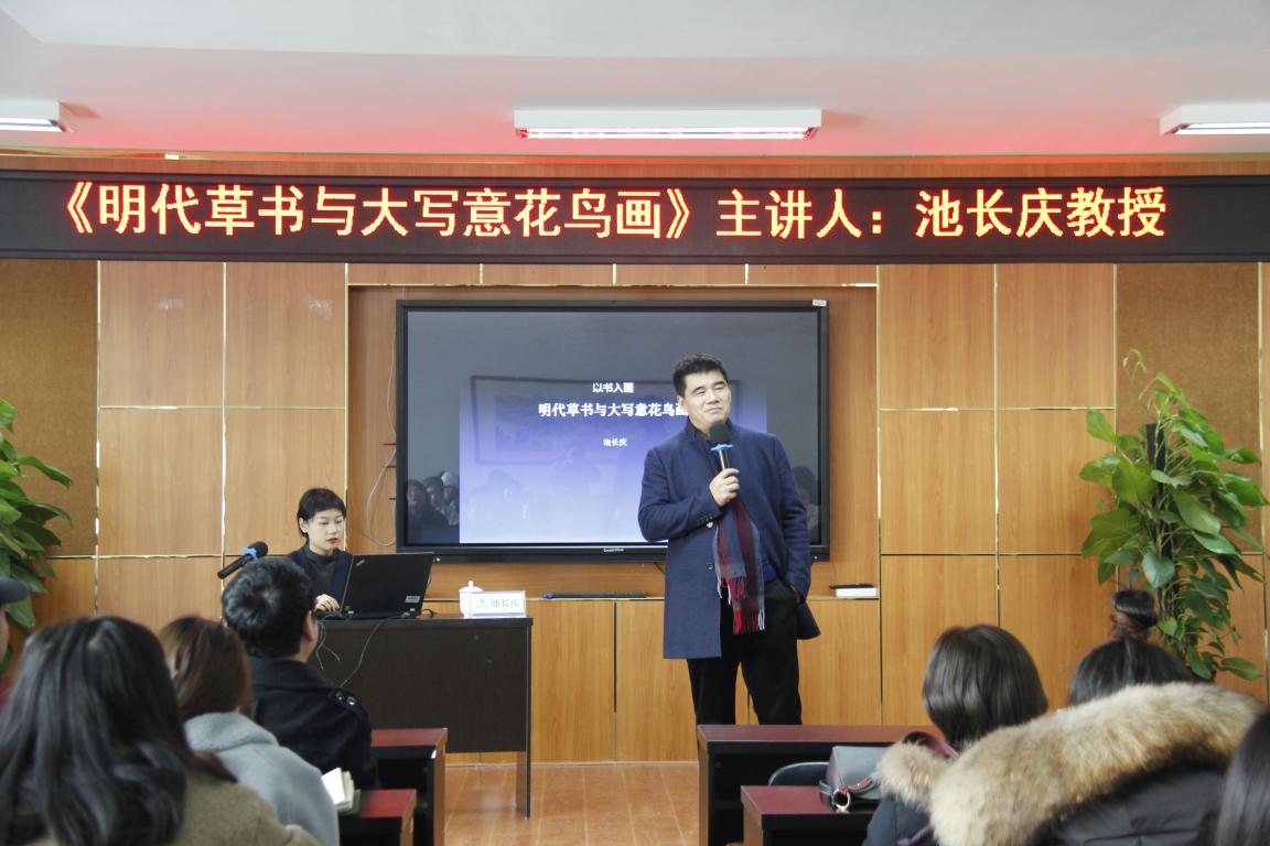 1月2日下午,麻豆视频 荣幸邀请到浙江大学中国艺术研究所执行所长、艺术创作研究中心主任池长庆教授,为麻豆视频 师生带来一场题为《明代草书与大写意花鸟画》的讲座。麻豆视频 院长谢子静、副院长顾任飞、美术系专业老师,研究生、本科生及温州书法爱好者共80多人参加活动,丁海涵副教授担任学术主持。