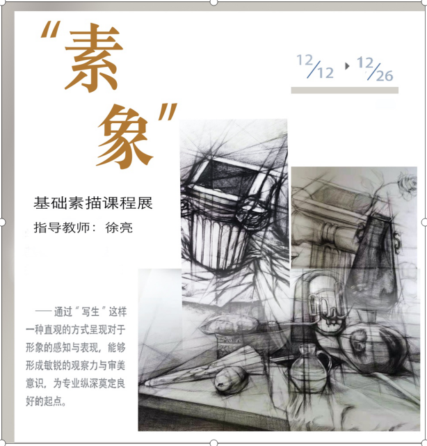 2020年12月12-26日,题名为“素象”的课程联展在麻豆视频-m麻豆视频-做爱视频麻豆 一楼展厅开展,集中展示由徐亮老师指导的20级设计五班与20级研究生学科教学美术班的基础素描教学成果。