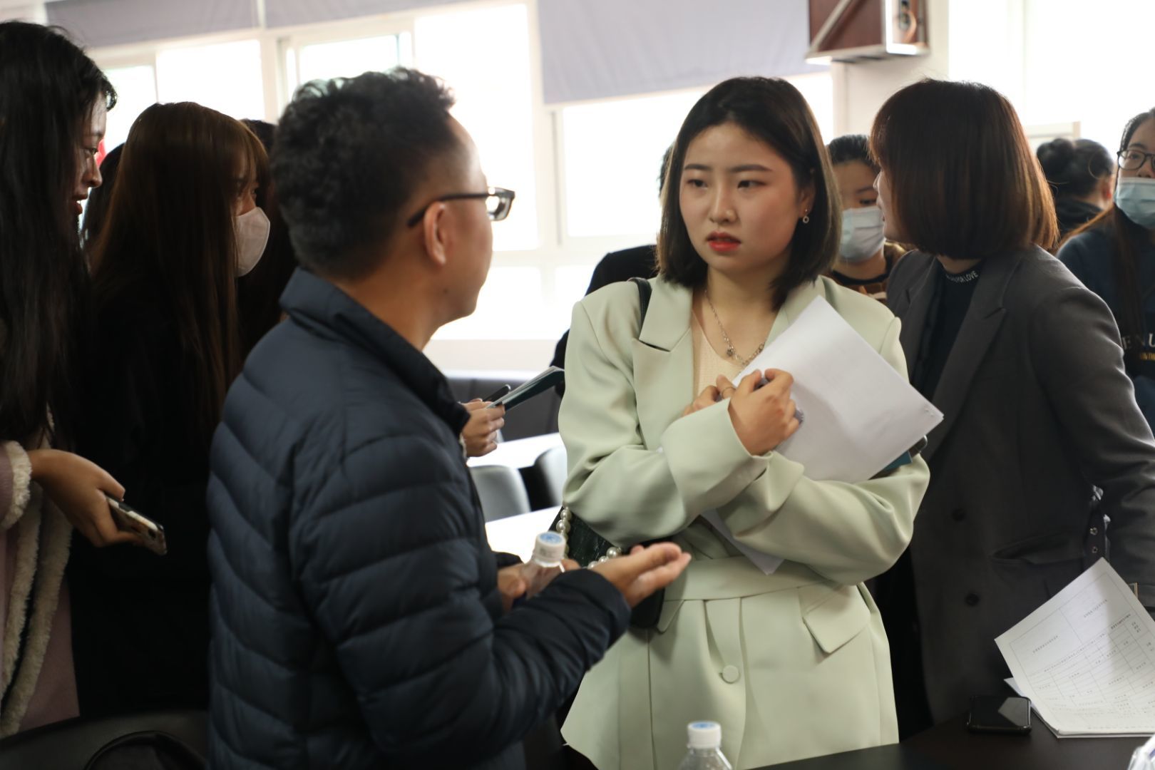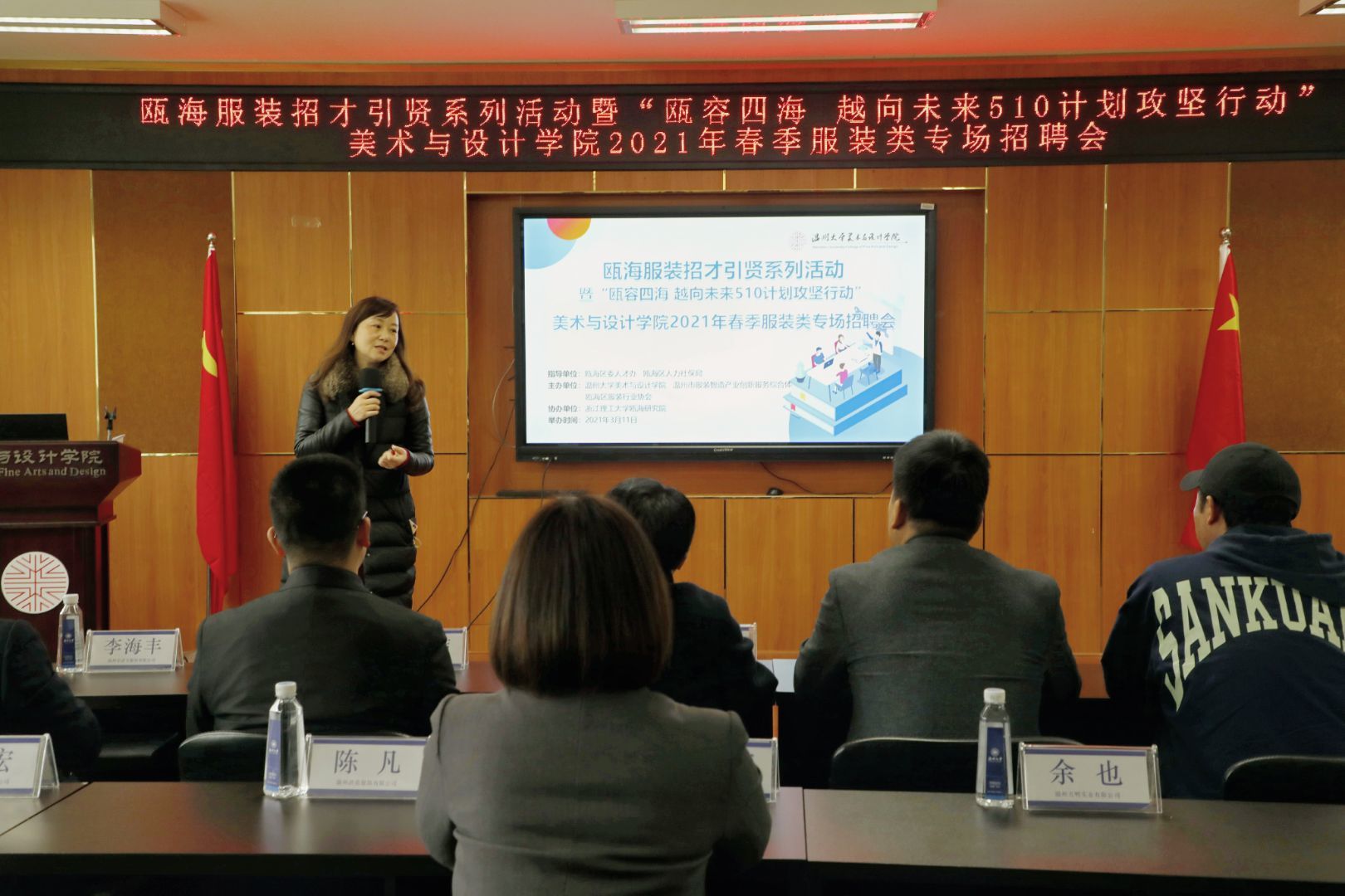 会议开始前,杨丽君副书记简要介绍了近几年麻豆视频-m麻豆视频-做爱视频麻豆 的发展、人才培养以及毕业生就业的相关情况。随后,瓯海服装行业协会秘书长苏立玲对瓯海服饰产业的基本情况进行解读,浙江理工大学瓯海研究院副院长,温州市服装智造产业创新服务综合体负责人任力介绍了综合体的设计思想,从重点项目、功能分布、设计亮点三部分对每个楼层进行分析。在了解瓯海对于高校大学生留温政策之后,11家企业负责人通过介绍企业、岗位需求、待遇三方面来讲述,为此次参加招聘会的同学提供就业岗位的机会。