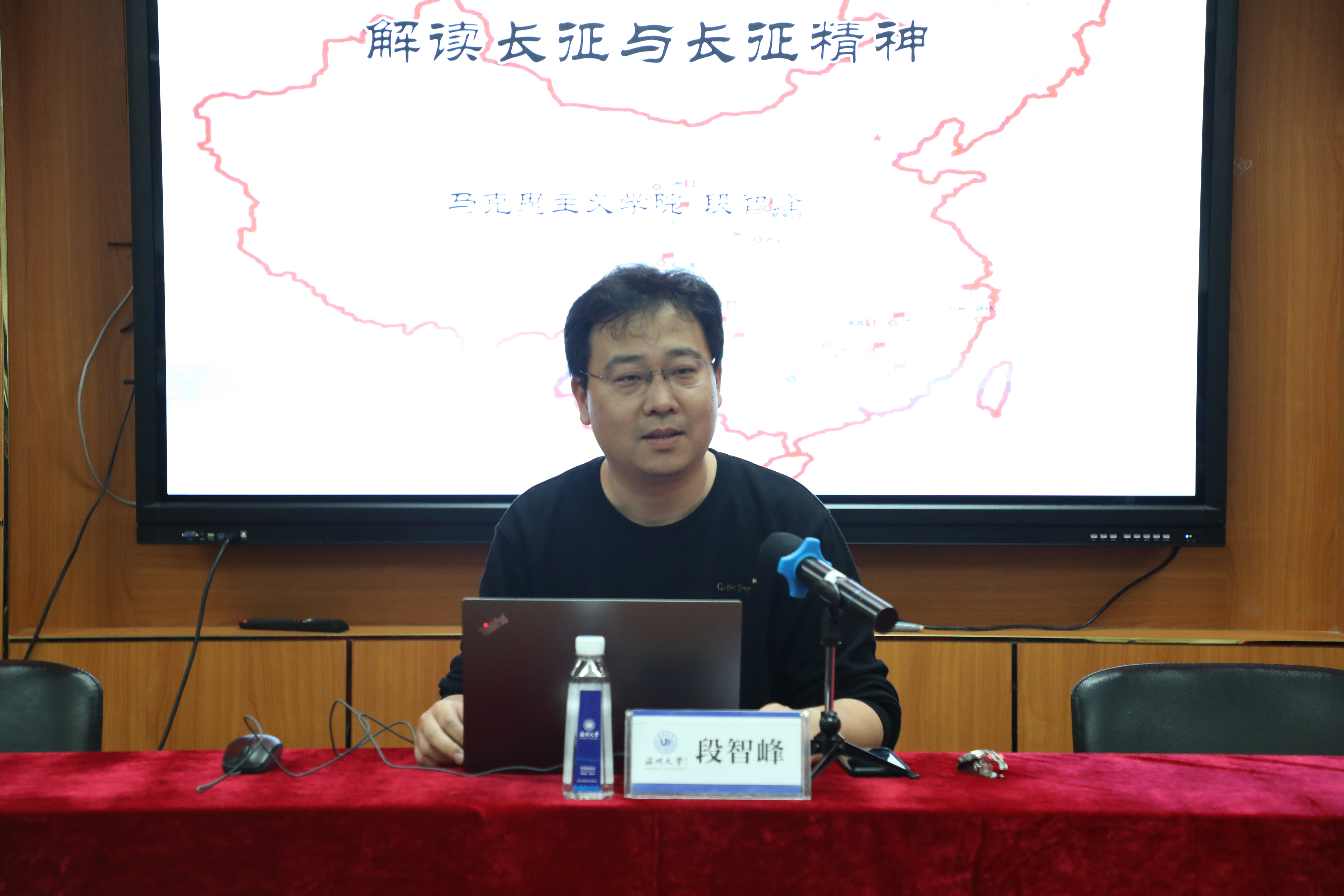 动员部署会后,马克思主义麻豆视频 博士、温大党史学习教育讲师团成员段智峰以《长征与长征精神》为题作专题讲座,段智峰博士从长征的概念、长征的原因、长征的历程、长征的意义与启示四个部分,用叙事的方式将丰富翔实的历史材料娓娓道来。段智峰最后强调开展党史学习教育意义重大,希望大家通过学习党史传承优秀传统,走好新时代的长征路。