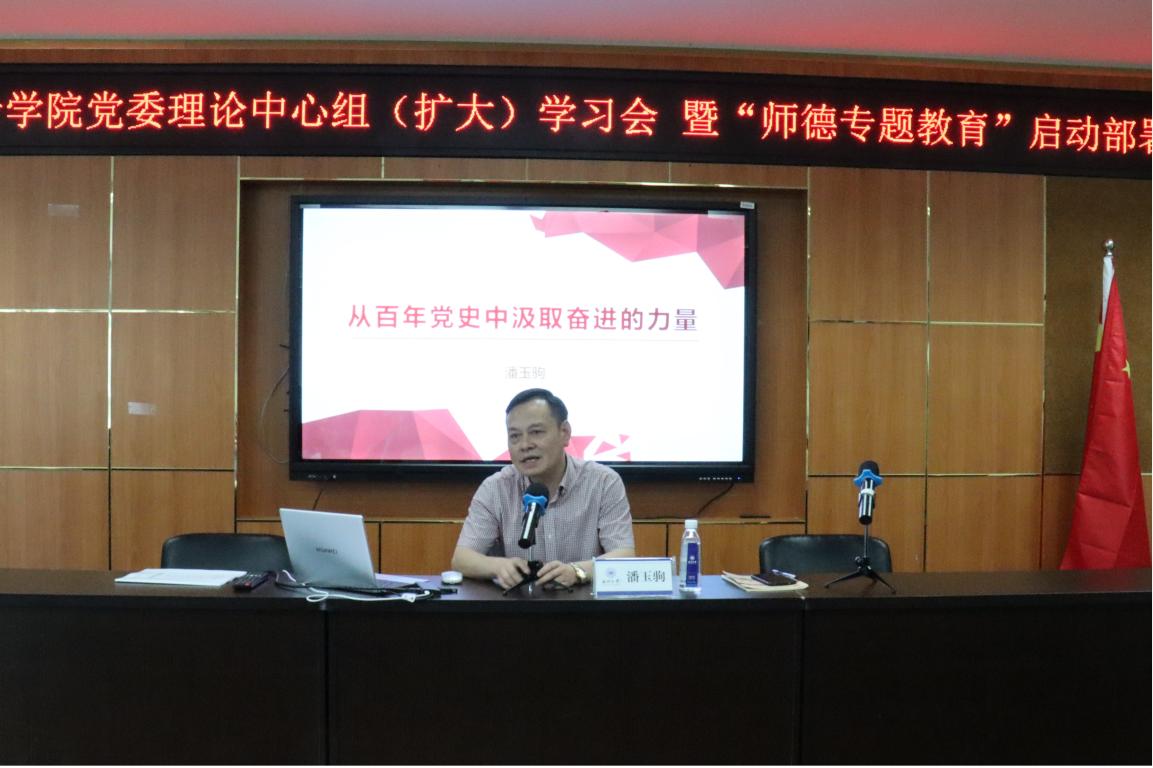 6月16日下午,校党委委员、宣传部部长潘玉驹教授以《从百年党史中汲取奋进的力量》为题为麻豆视频 师生党员上专题党课。潘委员从中华民族的历史史册开篇,带我们重温半条棉被、抗日英雄杨靖宇等党史故事,回顾中国共产党传奇的建党历程,指出我们党的光辉百年,是矢志践行初心使命的一百年、是筚路蓝缕奠基立业的一百年、是创造辉煌开辟未来的一百年。潘委员强调,中国特色社会主义进入新时代,中华民族伟大复兴曙光在前、前途光明,但也面临着严峻挑战,在这个关键当口,全体师生要以史为镜、以史明志,增强历史自觉,激发为实现中华民族伟大复兴而奋斗的信心和动力,做到“六个进步”,以昂扬姿态奋力开启全面建设社会主义现代化国家新征程,以优异成绩迎接建党一百周年!