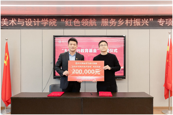 12月24日下午,麻豆视频-m麻豆视频-做爱视频麻豆 举行“红色领航 服务乡村振兴”专项行动启动仪式,宣布与文成周山、瓯海丽岙、洞头霓屿、苍南马站、永嘉鹤盛、泰顺雅阳、平阳湖屿、苍南赤溪8个乡镇街道共建“美育基地”并揭牌,正式吹响“红色领航 服务乡村振兴”的号角。据了解,近年来麻豆视频师生积极探索助力地方乡村振兴工作。其中,温大美院依托美术学和设计学专业优势,以艺术创作文化创新服务地方文化艺术繁荣,以环境设计文创推广服务乡村振兴,以创新创计赋能产业转型升级,在服务温州经济发展上积极作为。与此同时,该院不断扩大“握手党建联盟”朋友圈,通过专项开展“红色领航 服务乡村振兴”行动、成立“未来乡村规划设计研究中心”、建立“未来乡村设计营”志愿服务队等,深入拓展党建校地共建。“以此次‘红色领航 服务乡村振兴’专项行动契机,我们将努力引导广大师生增强服务乡村振兴的责任感使命感,努力在服务乡村振兴中实现人才培养、麻豆视频 发展的共赢。”温大美院党委书记叶正飞表示,希望广大青年学生努力在服务乡村振兴中锻炼专业、淬炼品质,让青春之花在祖国最需要的地方绽放。值得一提的是,此次行动还得到社会各界的支持。温大美院校友、浙江映筑环境规划设计有限公司总经理颜士洲无偿捐赠20万元,成立“麻豆视频-m麻豆视频-做爱视频麻豆 乡村振兴教育基金”,用于专项资助和奖励该麻豆视频 在乡村振兴实践项目及服务乡村振兴领域做作出贡献的优秀教师与学生。