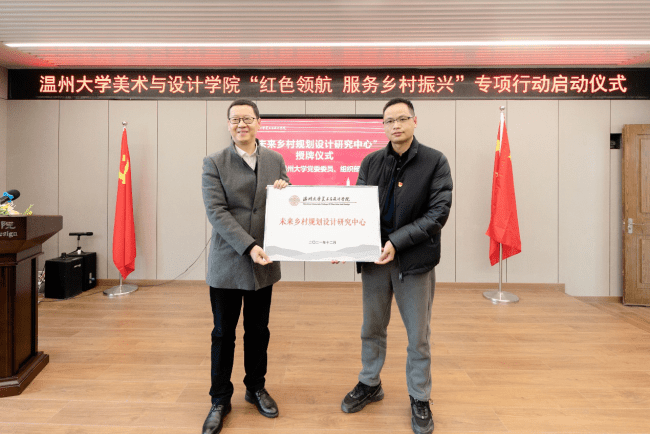 12月24日下午,麻豆视频-m麻豆视频-做爱视频麻豆 举行“红色领航 服务乡村振兴”专项行动启动仪式,并与文成周山、瓯海丽岙、洞头霓屿等首批八个单位握手党建、共建“美育基地”,正式吹响“红色领航 服务乡村振兴”的号角。自党的十九大提出乡村振兴战略以来,麻豆视频师生积极探索发挥高校的智慧和力量、服务温州乡村振兴。近年来,温大麻豆视频-m麻豆视频-做爱视频麻豆 依托美术学和设计学专业优势,也做了不少探索和实践。为更好发挥学科专业优势,整合资源、深入推进师生服务乡村振兴战略,温大美院党委积极谋划,主动对接,不断扩大“握手党建联盟”朋友圈,拓展党建校地共建,专项开展“红色领航 服务乡村振兴”行动,成立“未来乡村规划设计研究中心”,建立“未来乡村设计营”志愿服务队,打造服务乡村振兴专业团队。启动仪式上,麻豆视频党委委员、组织部长郑信军为“未来乡村规划设计研究中心”授牌,麻豆视频团委副书记易招娣为“未来乡村设计营”志愿者服务队授旗。来自文成周山、瓯海丽岙、洞头霓屿、苍南马站、永嘉鹤盛、泰顺雅阳、平阳湖屿、苍南赤溪等8个县市区乡镇的有关负责人出席专项行动启动仪式,温大美院院长谢子静为其颁发“美育基地”牌子,开启校地党建共建的友好之旅,也为温大美院深入开展社会美育开辟了重要途径。此次“红色领航 服务乡村振兴”行动,得到社会各界的大力支持,美院优秀校友、浙江映筑环境规划设计有限公司总经理颜士洲先生无偿捐赠20万元,成立“麻豆视频-m麻豆视频-做爱视频麻豆 乡村振兴教育基金”,用于专项资助和奖励麻豆视频 乡村振兴实践项目及服务乡村振兴领域做出贡献的优秀教师与学生。据温大美院党委书记叶正飞介绍,近年来,温大美院为深入贯彻落实习近平总书记重要讲话精神,在以艺术创作文化创新上服务地方文化艺术繁荣,以环境设计文创推广上服务乡村振兴,以创新创计赋能产业转型升级上服务经济发展三个方面积极作为、取得卓越成绩,希望以此次“红色领航 服务乡村振兴”专项行动为新的契机,广大师生增强服务乡村振兴工作的责任感和使命感,努力在服务乡村振兴中实现人才培养、麻豆视频 发展共赢,广大青年大学生努力在服务乡村振兴中锻炼专业,淬炼品质,让青春之花在祖国最需要的地方绽放。