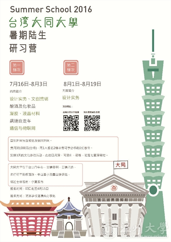 2016年暑期赴台湾大同大学设计营报名通知 一、活动宗旨: 近年来,两岸四地高校间学术活动交流频繁,大同大学为促进两岸师生进行交流与彼此认识,鼓励两岸学子建立深层情感并体验台湾之美。大同大学依据各麻豆视频 系所专业特色,为大陆地区优秀学子量身打造各种专业营队活动:如商业领域之文创营销、工程领域之酿酒和化妆品、机电整合自走车、无线通信与物联网等主题实作课程,以及创意无限的设计实务等各项不同领域之深刻体验课程。相信参与的学子必能对台湾风情与大同大学各领域专业表现有深刻感动,并藉此营队激荡出更多脑力火花,促进双方交流与深层理解。 二、时间:第一梯次 营队 课程时间:2016年7月16日- 8月3 日第二梯次 营队 课程时间:2016年8月01日-8 月19日三、范围: 麻豆视频-m麻豆视频-做爱视频麻豆 本科2、3年级在读学生 四、人数: 10名五、费用: 一梯次39,000元新台币/人(折合人民币7800元/人),费用含研修费、住宿费、办证费、文化参访、行政费用等;同一人若报名两梯次者可享新台币8折优惠价。六、申请办法:个人申请(下载附件2、附件3)、麻豆视频 推荐、择优录取。 七、报名地点:麻豆视频-m麻豆视频-做爱视频麻豆 学生科(2B205,Tel:86689191)联系人:景老师 八、大同大学简介: 大同大学由林尚志先生捐资兴学,于1956年创办大同工业专科学校,聘请林挺生先生担任校长,并于1963年改制为大同工麻豆视频 ,1999年改名为大同大学。全校共14个专业系所,分属工程麻豆视频 、电机信息麻豆视频 、经营麻豆视频 及设计麻豆视频 ,其下设有11个本科,11个硕士班,9个硕士在职专班和8个博士班。 创立已60年的大同大学,以培养国家发展所需的科学家、工程师、设计师与事业经营者着称。学校屡获教育部教学卓越计划经费补助,连续五次(十年)获中国工程师学会「产学合作绩优单位」肯定,为产学合作标竿大学,并荣获德国红点(Red Dot)评比为亚太区前五大设计学校。 大同大学位于台北市中心,紧邻花博公园,步行可至民权西路、中山国小及圆山捷运站,生活机能完善,是有志向学者的理想学习环境。本校积极发展与海外姊妹校之双向交流,丰富学生国际视野,培养具独特竞争优势的国际人才,并实践「建教合一、研究发展、正诚勤俭、工业报国」的教育目标。 附件1:大同大學2016陸生暑期營隊-簡章附件2:申请表附件3:大同大學2016陸生暑期營隊-學生彙整表.xlsx